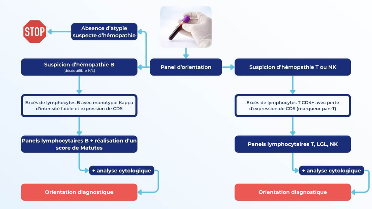 L’immunophénotypage lymphocytaire constitue un outil essentiel dans l’exploration d’une lymphocytose, permettant une caractérisation rapide, précise et approfondie des populations lymphocytaires. Grâce à la cytométrie en flux et à l’analyse d’un large panel de marqueurs, il contribue à distinguer les formes réactionnelles des hémopathies lymphoïdes prolifératives et à orienter le diagnostic de manière ciblée. Intégré dans une démarche diagnostique pluridisciplinaire, il participe à une prise en charge optimisée et à une orientation rapide du patient dans son parcours de soins.